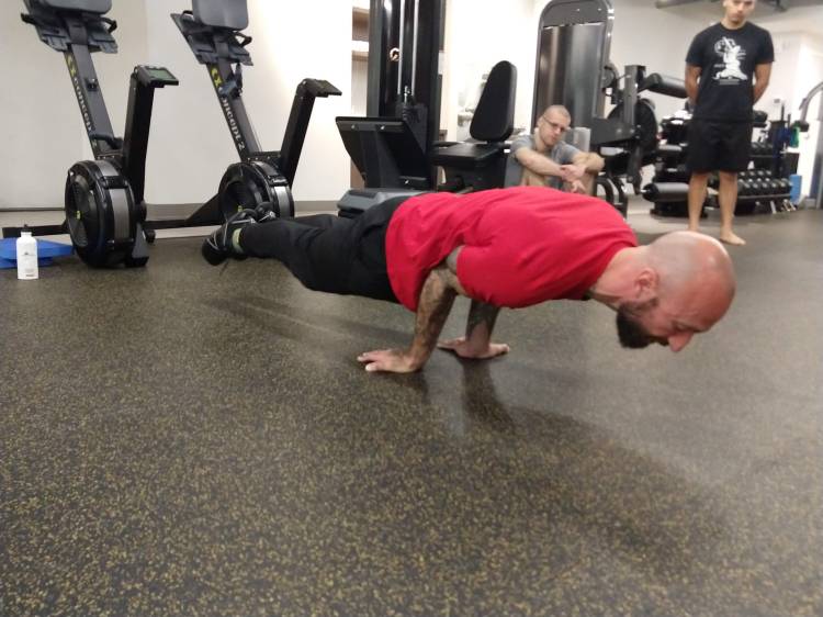The clinic was two days of calisthenics instruction, lectures and hands on practice, about 15 hours of total time. We learned how to progress from simpler calisthenics skills to more difficult ones, and the class was geared towards trainers and coaches. At the end we were tested on “the century”, which was 40 squats, 30 push ups, 20 hanging knee raises and 10 pull ups in 8 minutes. Form was strict and your reps were judged. You could NOT break posture or rest and each rep had to be a full range of motion. I passed (barely), which meant I got an instructor certification. Probably about 7 or 8 students did not pass.