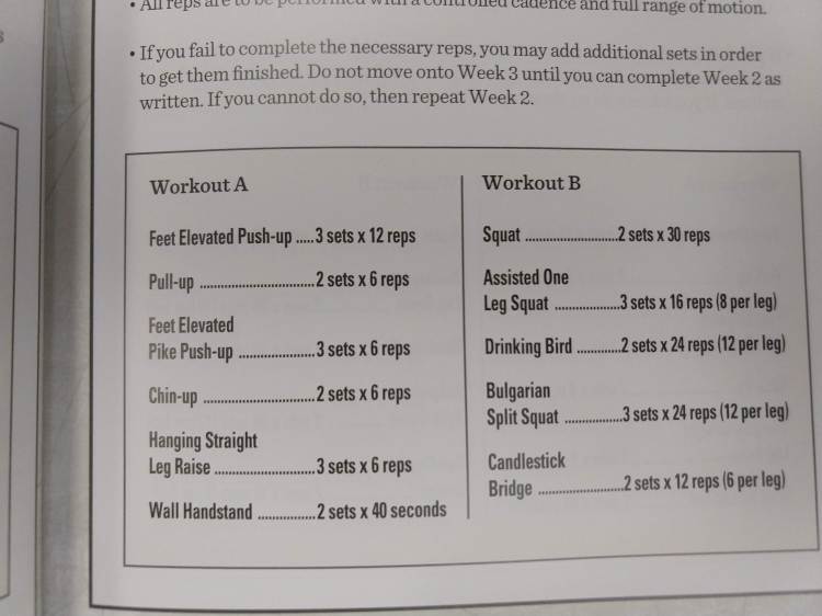 and decided to get started on the training program right away. Get Strong is a 16 week program of progressive calisthenics in four phases of four weeks each. From week to week you add reps and exercises and sets and then at the end of each phase you must pass a test in order to progress to the next phase. By the end, provided I can handle it, I will be doing some of the more complex moves such as pistol squats, archer push ups, and handstands.